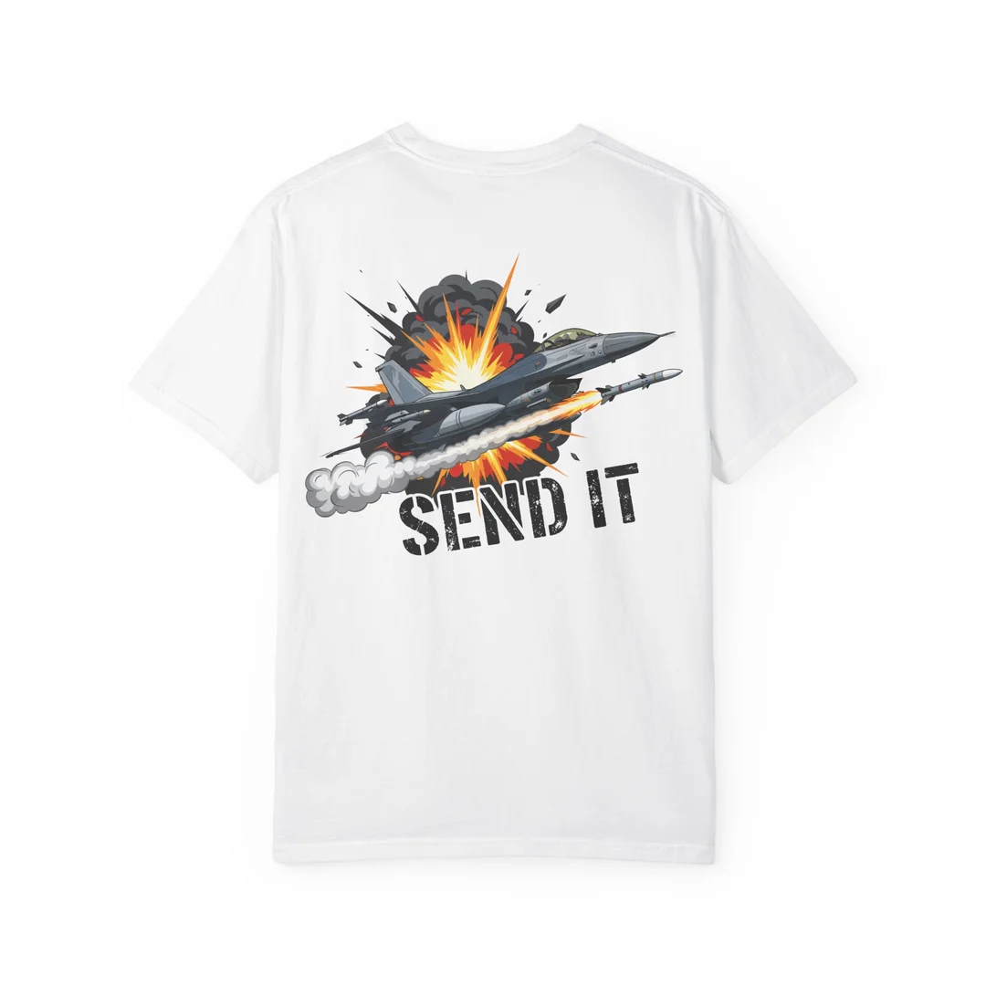 Light it up. This garment-dyed tee pairs ultra-soft ringspun cotton with a back print that says it all: SEND IT. Front left-chest Veteran Designed logo, fighter-jet graphic on the back, and all-day comfort for airshows, range days, and weekends.